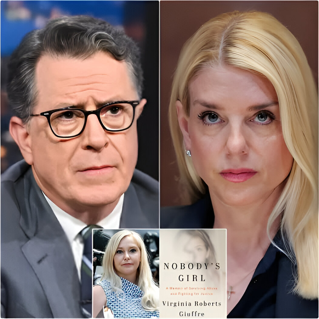 The late-night host praised Giuffre’s courage — then turned his outrage toward Pam Bondi, accusing her of “keeping truth buried to protect the powerful” and pointedly suggesting she read the book herself. What Colbert vowed to do next sent shockwaves through the country